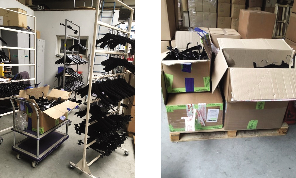 Nous récupérons les cintres vendus qui ont été utilisés pour le transport de vêtements de nos clients. Nous les trions, nettoyons, remettons les housses, et faisons un re-colisage à l'identique.